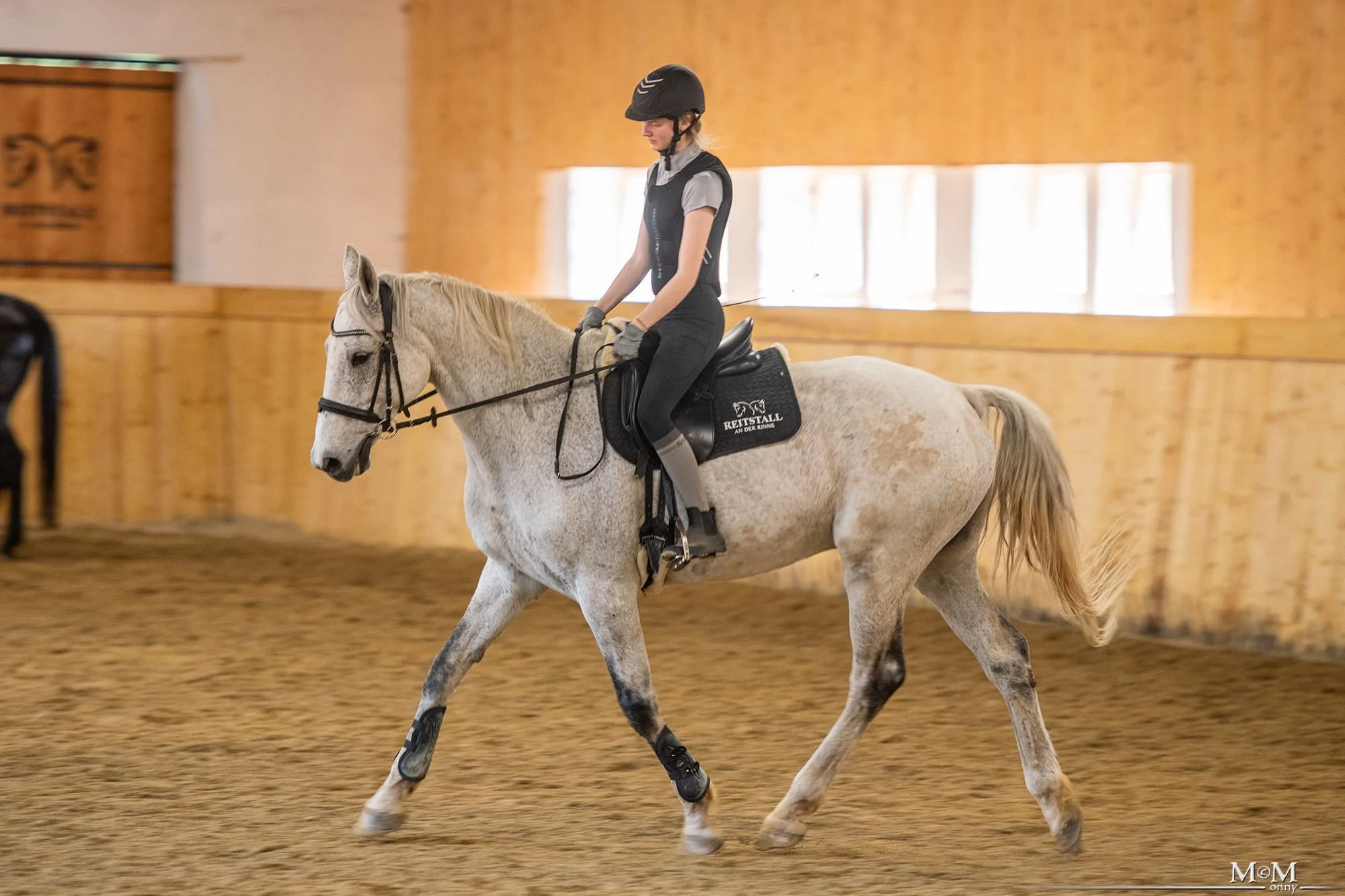 Auf dem Foto seht ihr unser Schulpferd Leo mit seiner Reitschülerin beim Dressurunterricht.